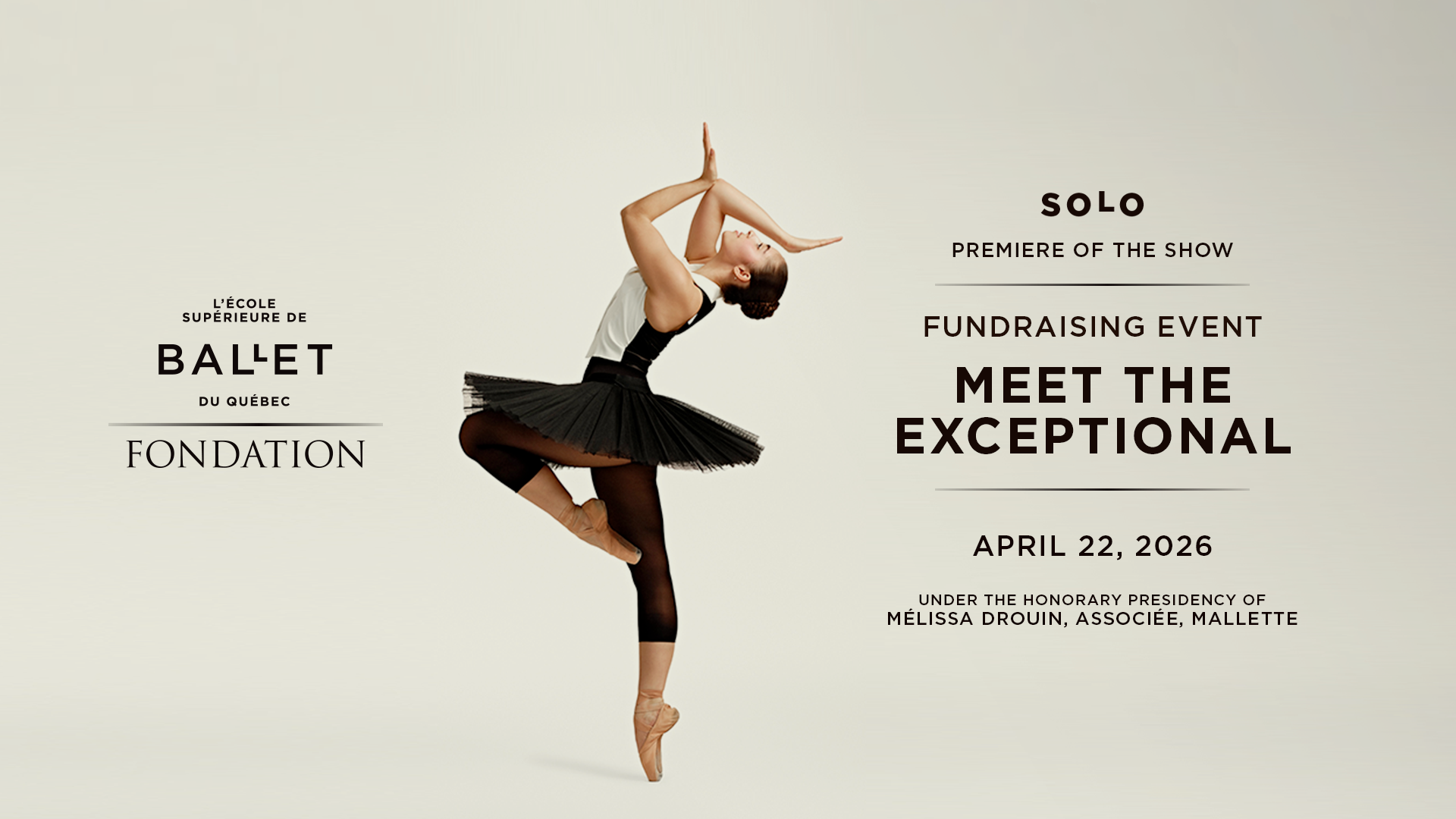 “It is with immense pride that I will chair the Meet the Exceptional benefit evening. With passion and rigor, the École supérieure shapes the artists of today and tomorrow. It makes a remarkable contribution to the influence of dance both here and internationally. Together, let's support the next generation of artists!” - Mélissa Drouin.
