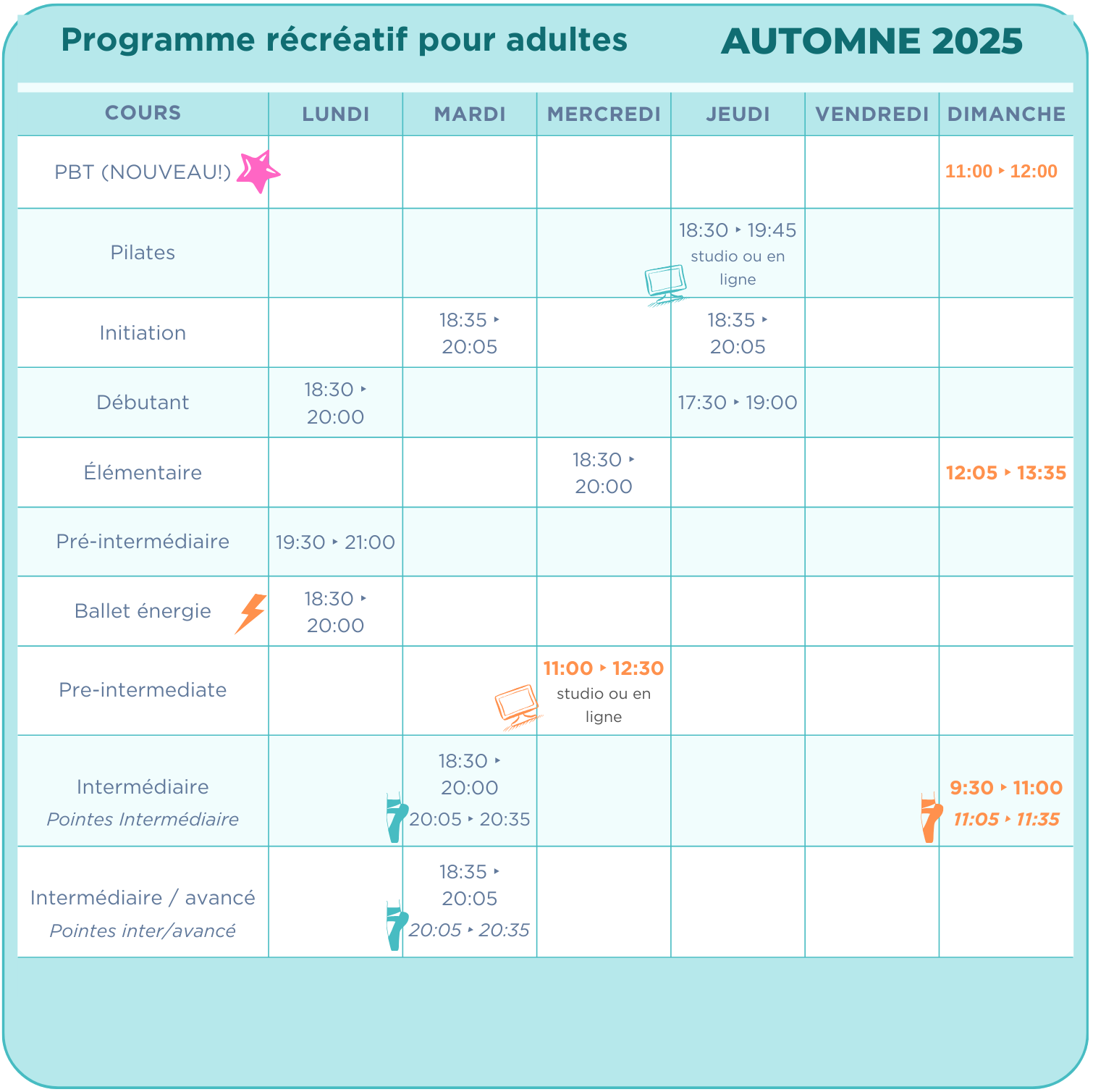 Découvrez nos cours de ballet pour tous les niveaux, ainsi que nos cours de pointes, de Progressing Ballet Technique (PBT). Plusieurs cours sont offerts en studio et en ligne pour s’adapter à votre horaire.